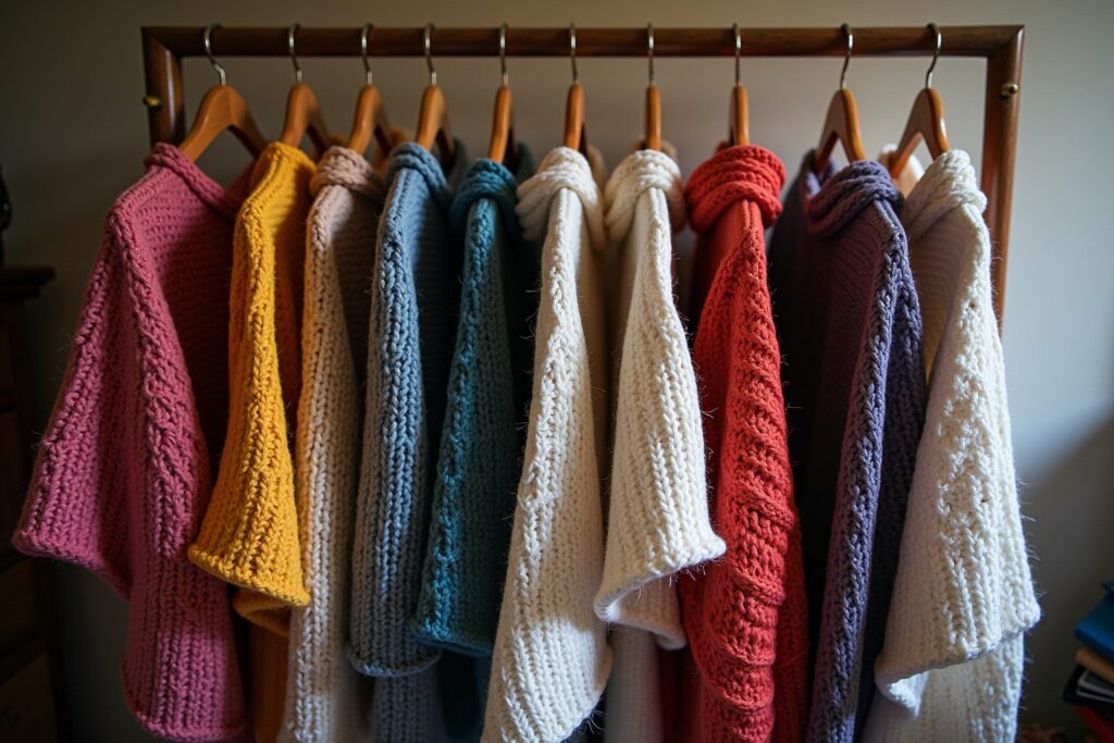 Für die wärmeren Tage oder als stilvolles Accessoire über einem Kleid. Ein Poncho mit filigranen Lochmustern (Lace) wirkt luftig und elegant. Hier sind präzises Stricken und oft auch die Verwendung von dünnerem Garn gefragt.